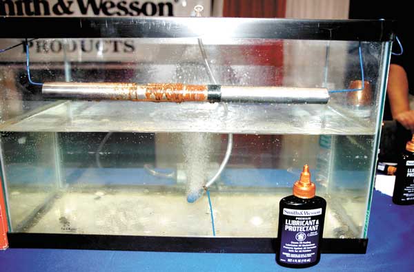This polished carbon steel pipe was sprayed with heavy salt content water for 60 hours. The left side, which was left “in the white,” had serious corrosion that will result in pitting of the surface. The right side was coated with the revolutionary new Smith & Wesson Protectant and Lubricant only once before beginning the test.